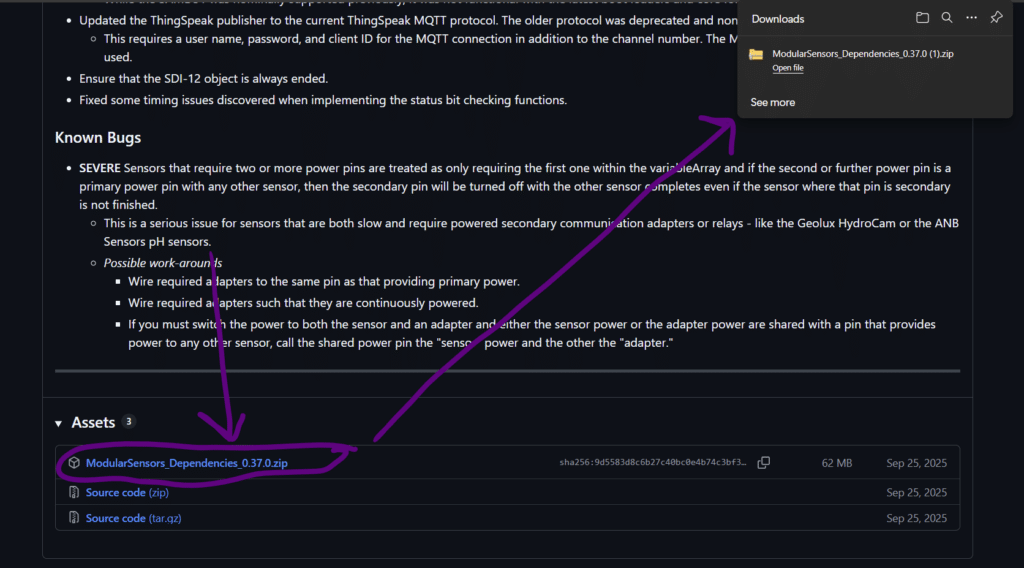 - Follow the instructions carefully in that section for installing the recommended EnviroDIY libraries.zip file and adding it to your Arduino IDE.