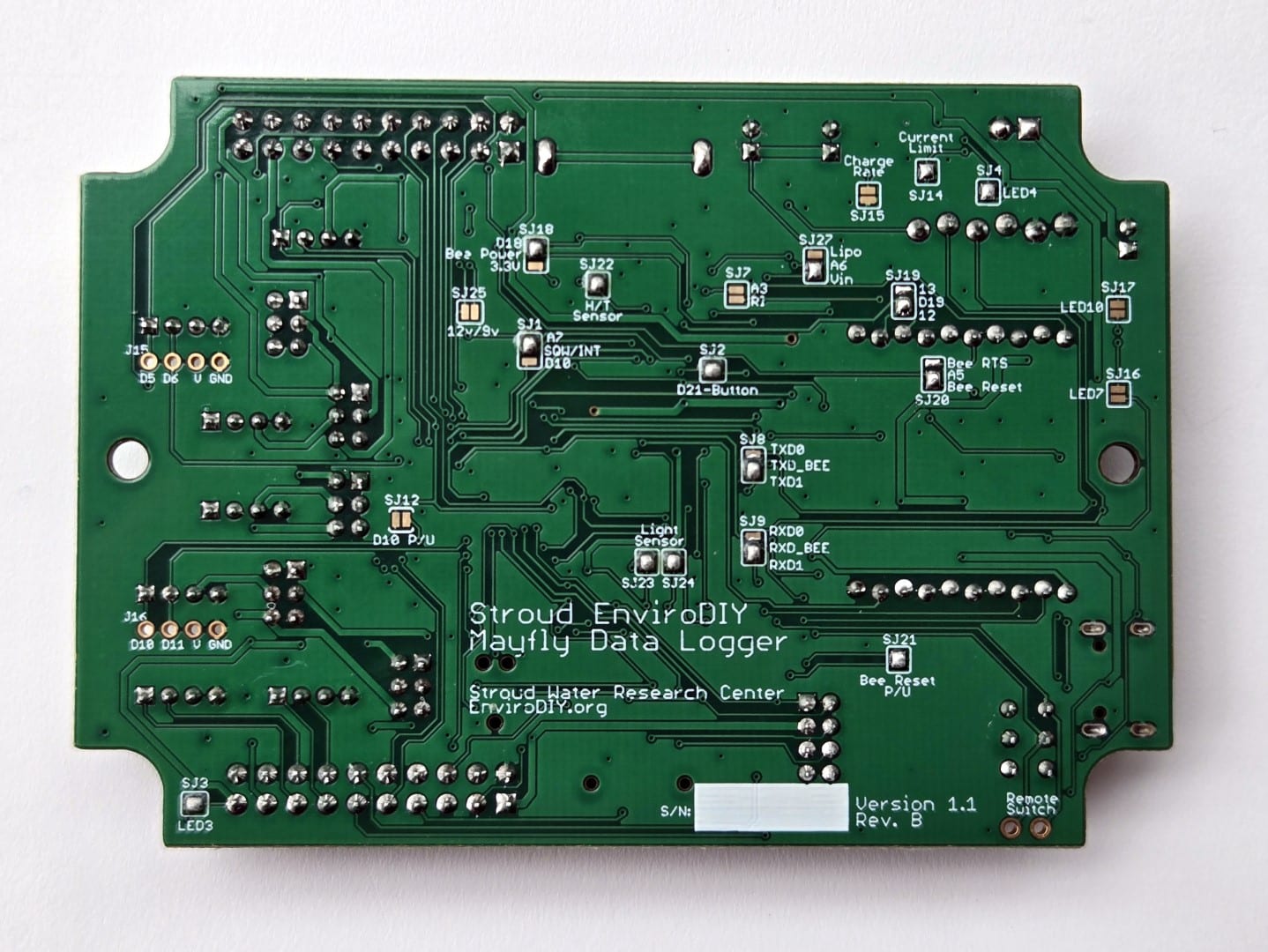 On the back of the Mayfly v0.5b board (boards made between 2016 and 2020), there are 12 user-configurable solder jumpers