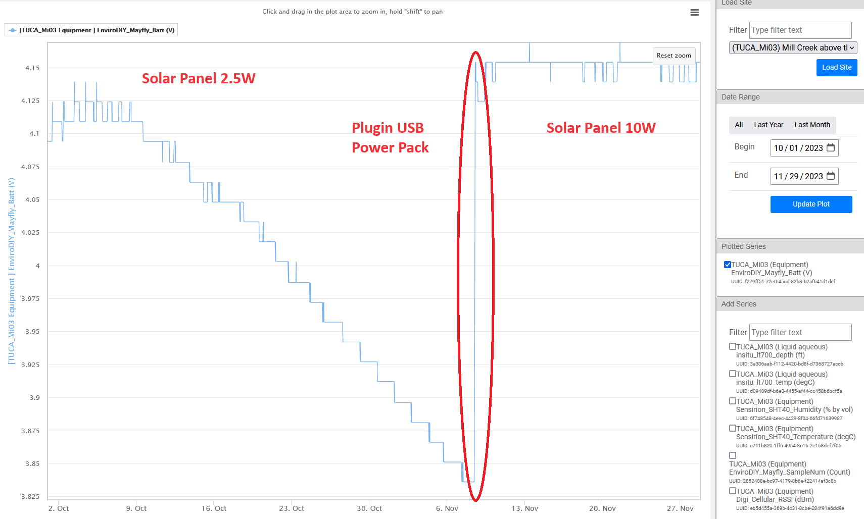So I’d say check your solar panel voltage, remove your GPRSbee, and replace the microSD card. If none of those fix the issue, put a new Mayfly in there. If the battery levels still fall, then replace the solar panel. If none of that solves the problem, then it’s likely just a shady location. If you’ve got deciduous trees around the station, sunlight should be improving in the coming weeks as the leaves fall, so that may also affect your results. We have a few stations that always struggle to stay charged during summer because of the full canopy above them, but they do great the rest of the year, even in the winter when the sun angle is lower.