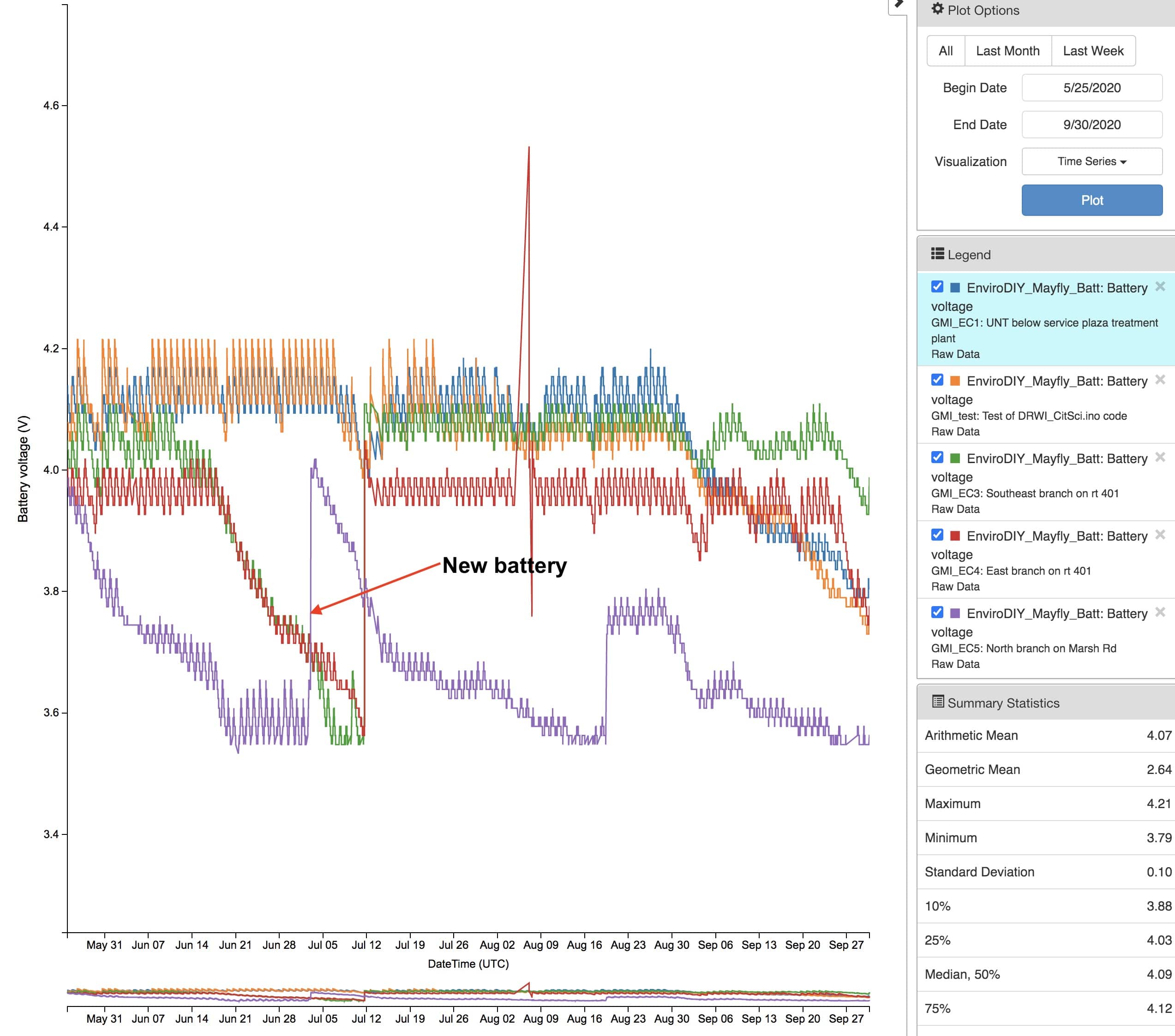 Without having been to that station myself, it’s hard for me to guess why that station is having more battery trouble than your other ones. I’m guessing maybe it’s more shaded, or possibly the solar panel isn’t pointed in an optimal direction? You could also try putting a voltmeter on the panel on a sunny day and make sure it’s putting out around 6v (or even better, put an ammeter in line and read the charging current). We’ve had a couple of panels fail over time and don’t provide enough power to fully charge a battery. We’ve also seen issues where the charge controller circuitry on the Mayfly would partially fail and cause it to default to the trickle charge rate instead of full current charge. We’ve also had malfunctioning GPRSbee modules that tend to drain the battery power quicker even when asleep. I’ve also seen problems with microSD cards that start to go bad and draw excess current when the Mayfly is supposed to be sleeping.