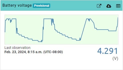 Crazy, today at 1:30pm the battery voltage read 4.958. 15 min before that nothing, after that nothing. It’s been cloudy and snowing all day.