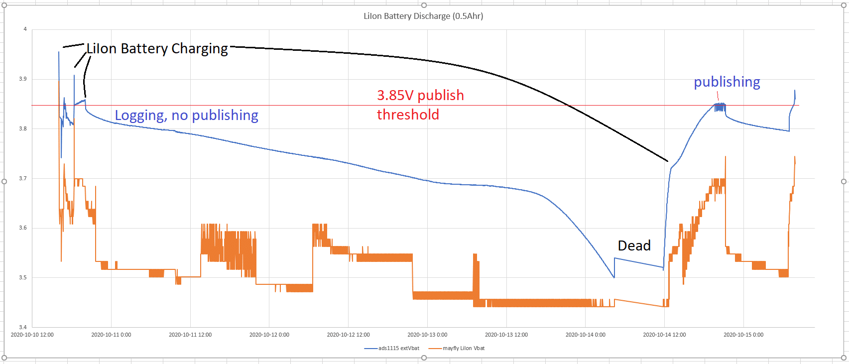 I’ve used the 3.85 threshold as I found the Mayfly was resetting when the WiFi turned on and LiIon battery was around 3.7V.