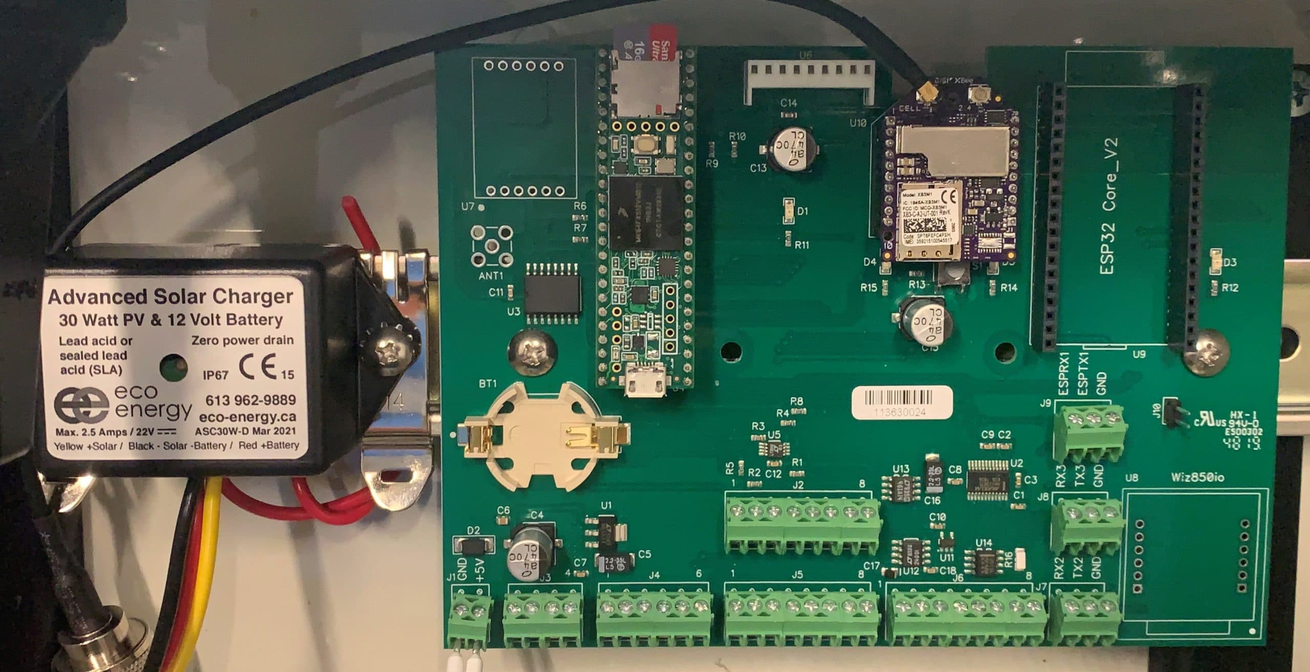 Yes, we have solar to the charger and into (2)12V 9aH batteries (in parallel). The Teensy and Xbee are on a custom motherboard we designed. Has lots of the IO broken out and spots for Adafruit GPS, RTC battery, ESP32 (older requirement) and Wiz850io Ethernet.