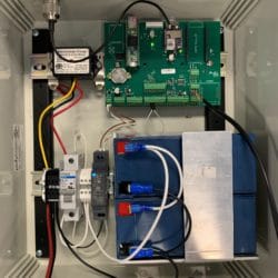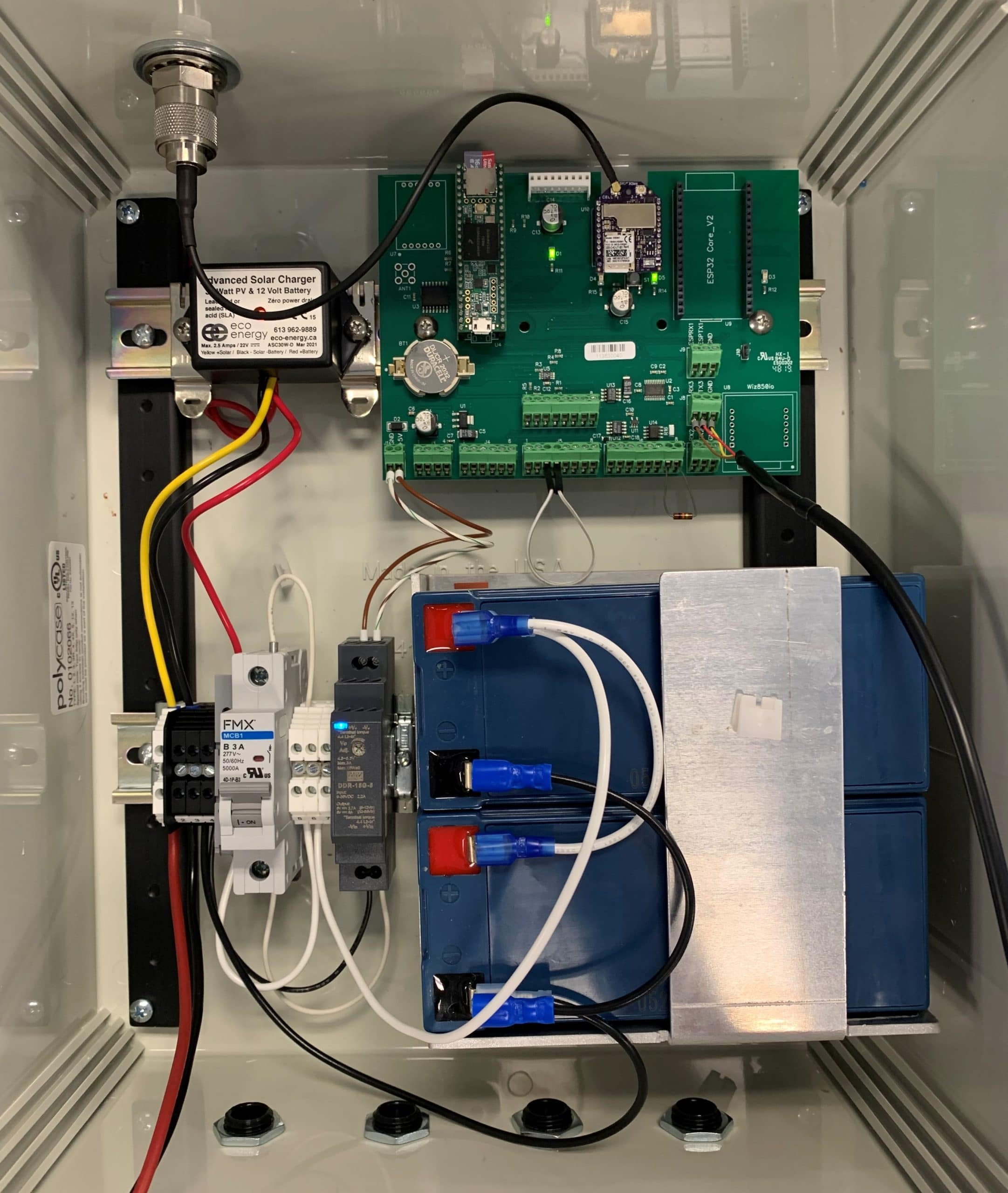 We made a custom din rail bracket to hold the two batteries. 10W panel for solar but charger will accommodate up to 30W